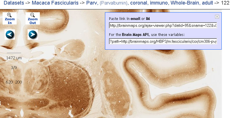 Brain Maps APIThe Brain Maps API is a lightweight multiresolution image viewer with customizable label overlays that lets you embed BrainMaps images in your own web pages with JavaScript, and that can also be used with your own multiresolution images. It has been designed to be small and fast, and to consume very little memory, yet still be very functional and extensible. The Brain Maps API is a free service, available for any web site that is free to consumers. Click on the thumbnail below to see an example of the Brain Maps API in action, and when you do, try using your mouse scroll wheel to zoom in and out. ![]() Getting StartedDownload the following files (by right-click and save):Say that your web server is called http://MYSERVER.COM. If you upload these files to your web server, then try loading the following page: http://MYSERVER.COM/ajax-viewer.html?path=http://brainmaps.org/HBP2/c.aethiops/AGM1/AGM1-highres/350/&height=78181&width=92160 You will see Brain Maps is now on your site, and it should look like the page at the following URL: http://brainmaps.org/ajax-viewer.html?path=http://brainmaps.org/HBP2/c.aethiops/AGM1/AGM1-highres/350/&height=78181&width=92160 Required Variables There is one javascript variable that must be specified, either through the URL or through the HTML source code: the image path. The 'path' refers to the absolute or relative image path. It is also recommended that you specify the height and width of the image in pixels, though the Brain Maps API will try to obtain these values automatically if they are absent. Currently, you can obtain all of these variable values from BrainMaps images of interest by clicking on the